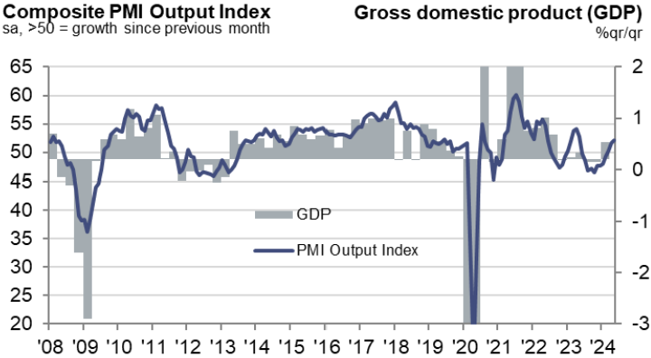Der Konsum steigt ggü. Vormonat um 0,3% und auch die Industrieproduktion nimmt um 0,2% zu. Leicht unter den Vormonatswerten liegen die S&P PMIs für den Dienstleistungssektor (sinkt von 54,8 auf 53,5 Zähler) und für den Produktionssektor (sinkt von 51,3 auf 51,0; neutral = 50). Damit bleibt die Stimmung der Einkäufer zwar grundsätzlich positiv, aber entfernt sich wieder vom bullischen Bereich (PMI größer 55).